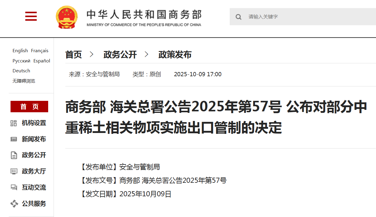 商务部 海关总署公告2025年第57号 公布对部分中重稀土相关物项实施出口管制的决定 | 2025-10-10 |