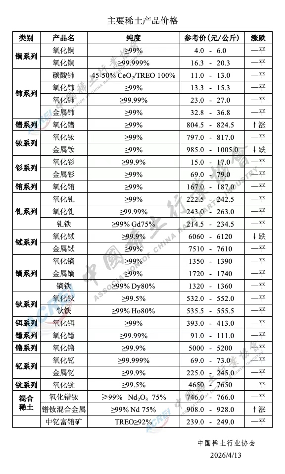 | 2026年04月13日主要稀土产品价格 | 2026-04-13 |