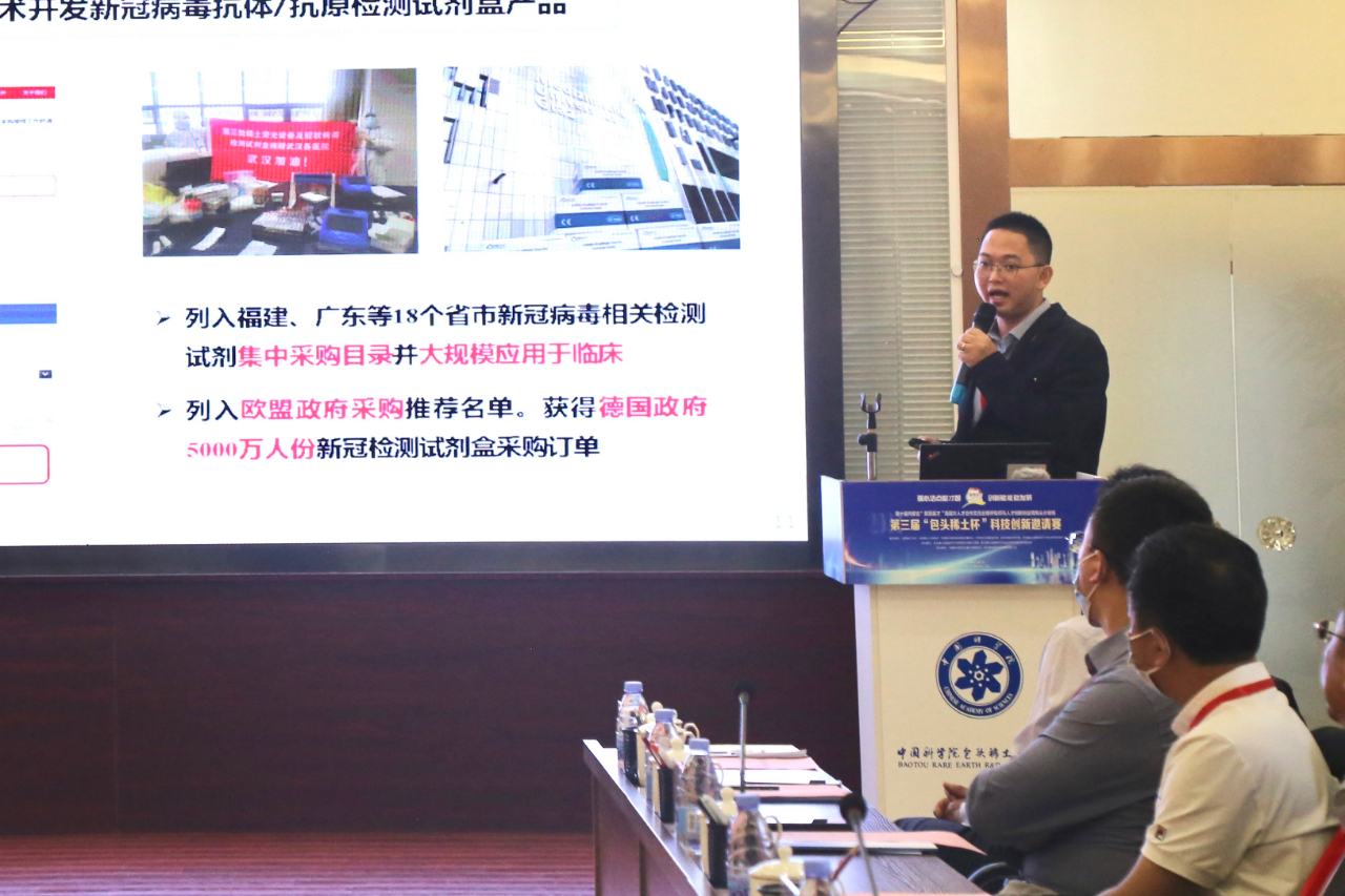 决赛项目在现场进行了激烈角逐,每个项目进行20分钟路演展示和10分钟的评委问答环节。中国稀土行业协会秘书长杨文浩、中国稀土学会副秘书长张安文、内蒙古科技大学材料学院院长宋希文、包头稀土研究院副院长李波、中国科学院力学研究所研究员夏原、中国科学院福建物质结构研究所研究员杨帆、国家纳米科学中心研究员王奇等资深专家组成评审团,从市场前景、技术水平、团队构成、商业模式、运营管理五个方面对参赛项目进行逐一评判。